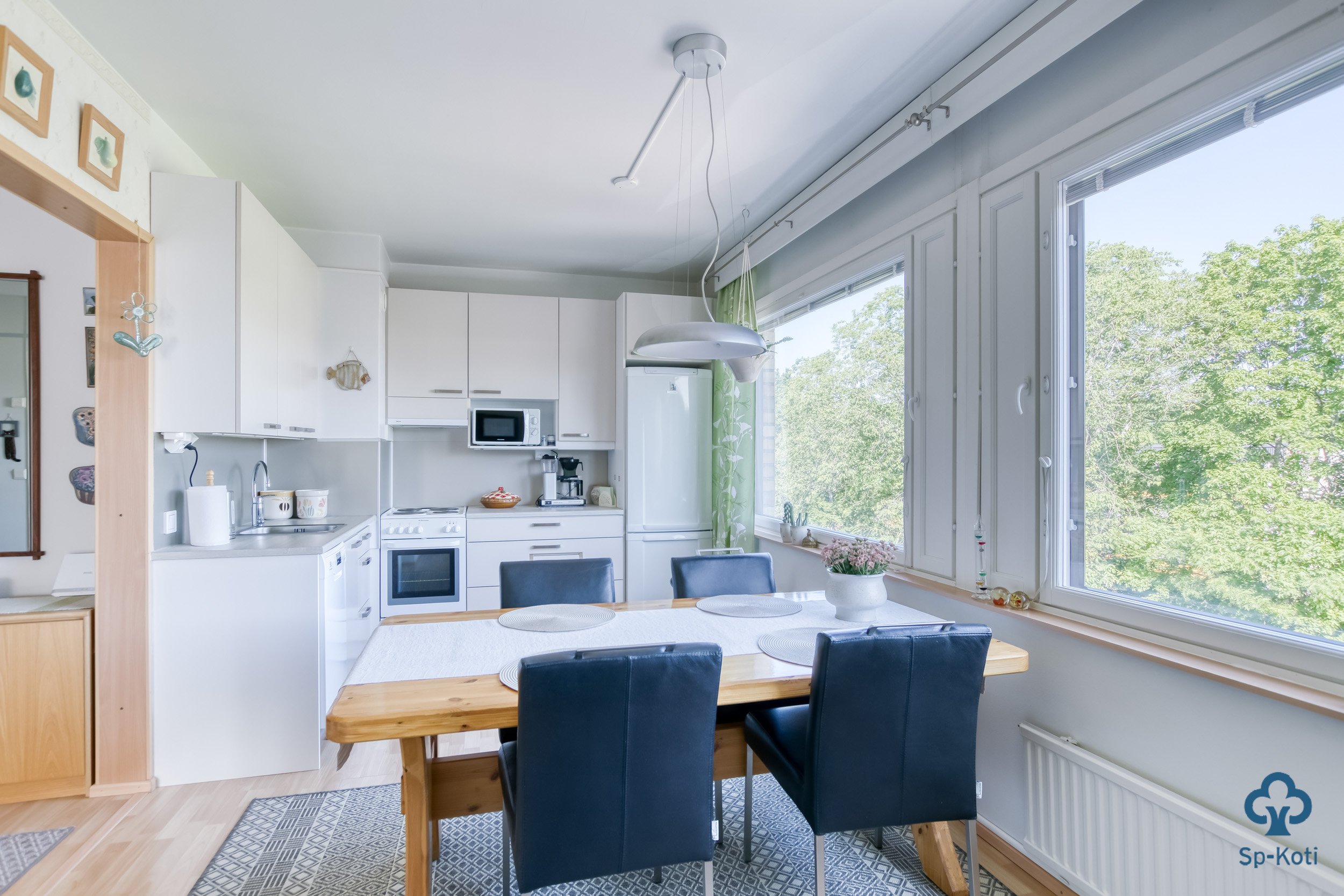 Asunnossa on tilava olohuone ja viihtyisä makuuhuone, joka avautuu lasitetulle parvekkeelle. Keittiön ja entisen makuuhuoneen seinä on poistettu, joten nykyään keittiö on ihanan tilava.