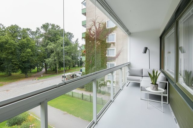 Den här lägenheten bjuder på fina vyer och mycket dagsljus tack vare de stora fönstren. Bostaden ligger på tredje våningen i ett välskött husbolag.