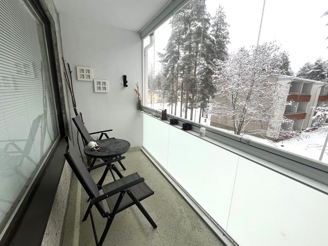 Asunto sijaitsee ylimmässä kerroksessa, mikä tuo mukanaan rauhaa ja näkymät etelään suuntautuvalta lasitetulta parvekkeelta.