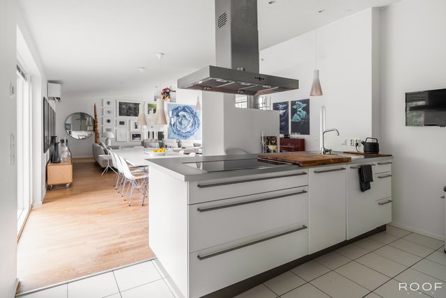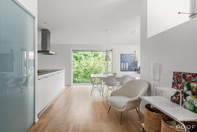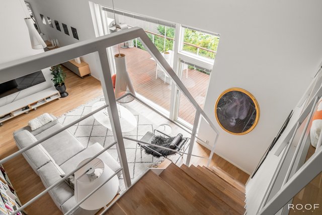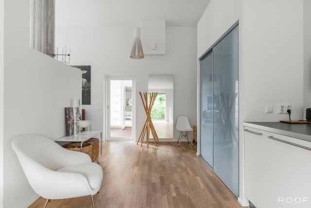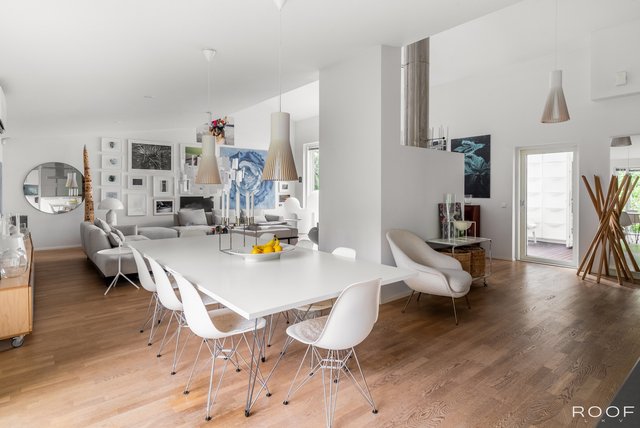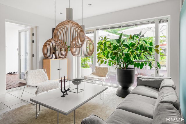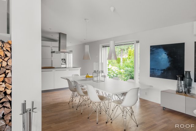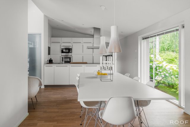 Tämän kodin keskipisteenä toimii avara- ja valoisa olohuoneen-, ruokailutilan- sekä keittiön saumaton ja viihtyisä kokonaisuus. Täällä suuret ikkunapinnat tuovat tilaan runsaasti valoa, huonekorkeus luo tilantuntua sekä avaruutta, ja takan luoma tunnelma viimeistelee kodikkuuden.