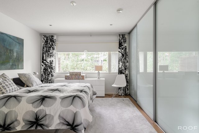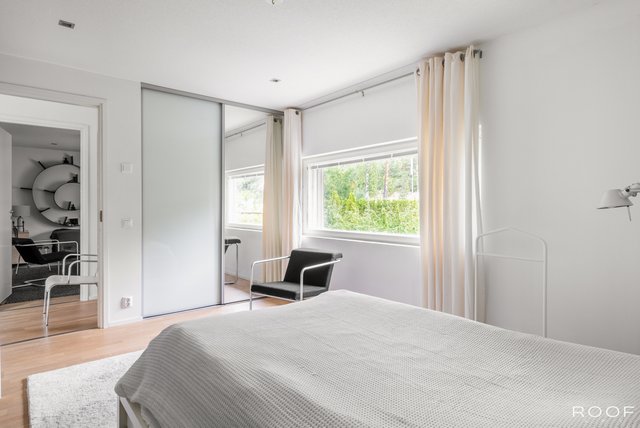 - Kaapistot (kiinteät, kirjahylly), sälekaihtimet/rullaverhot, verhotangot (makuuhuoneissa), naulakko (eteisen kaappi), kiinteät valaisimet, ilmalämpöpumppu (asennettu 12/2023), hälytys- /valvontajärjestelmä, istutukset, pyykinpesukone, kuivauskaappi/-rumpu. Lasiverannan seinällä sijaitsevat kenkätelineet.