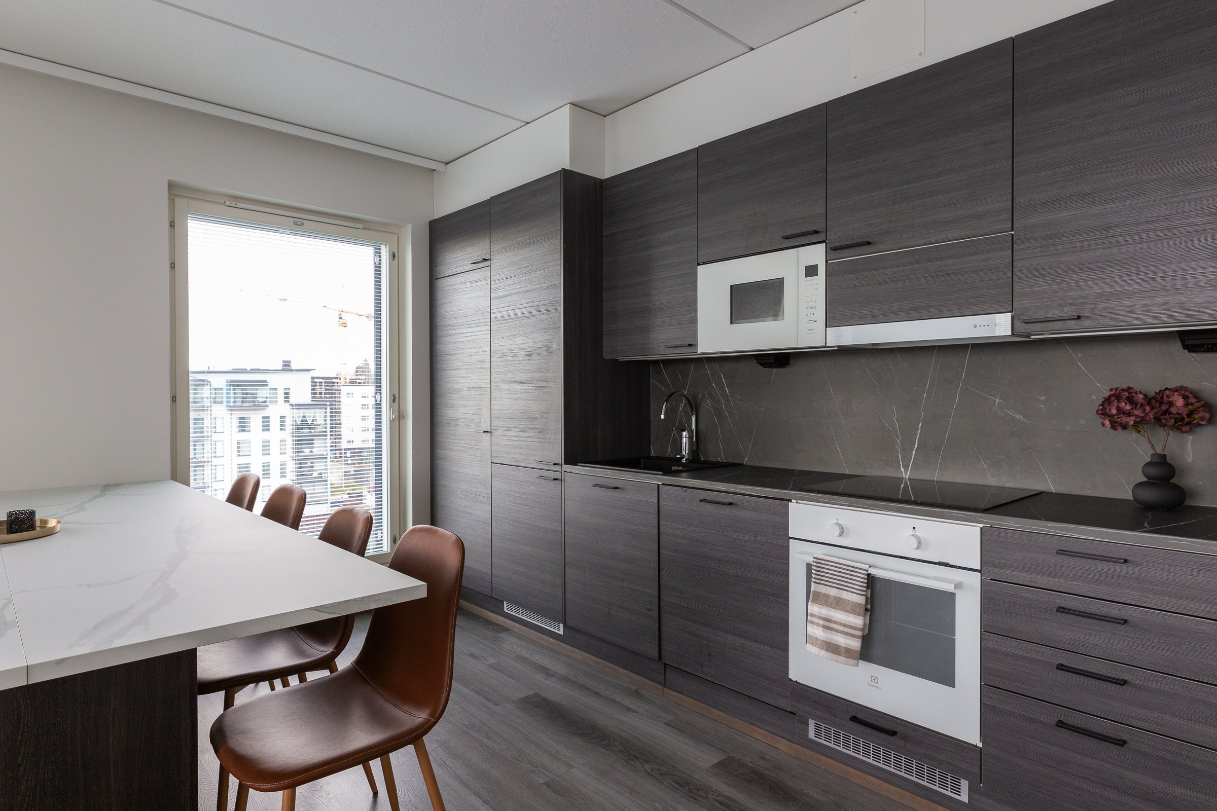 - Jääkaappipakastin (integroitu), liesi (taso integroitu), astianpesukone (integroitu), liesituuletin, mikroaaltouuni (integroitu), erillisuuni (integroitu), ja allas (komposiitti)