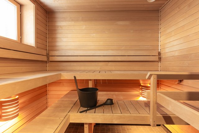 Sauna, jonka ikkunasta avautuu järvimaisemaa, ja kylpyhuone kahdella suihkulla ovat kuin yksityinen spa.