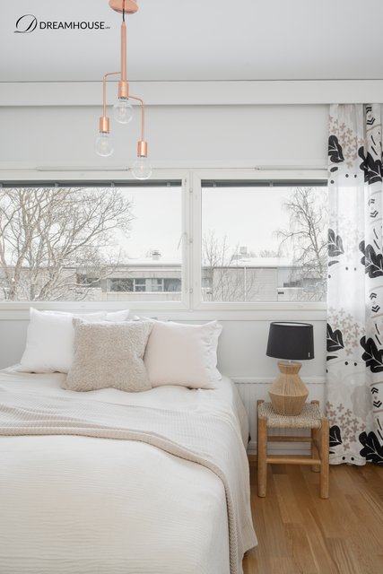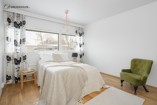 Makuuhuone on poikkeuksellisen tilava jonne mahtuu helposti suuri parisänky, yöpöydät sekä runsaasti säilytysratkaisuja ilman, että tila tuntuu ahtaalta. Tyylikäs kylpyhuone lattialämmityksineen ja moderneine varusteineen viimeistelee asumismukavuuden ja tekee arjesta sujuvaa. Kylpyhuoneessa on harvinainen ikkuna tuomaan luonnonvaloa tilaan.