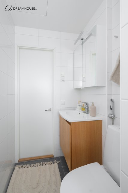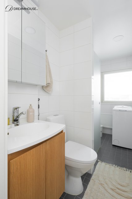 - WC-istuin, suihku, suihkuseinä, pesukoneliitäntä, lattialämmitys, peilikaappi, pesuallas, allaskaappi, ja bidee-suihku
