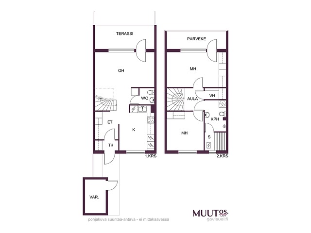 Alakerrassa sijaitsevat tilava olohuone, keittiö, eteinen sekä oma terassi, joka kutsuu nauttimaan ulkoilmasta. Yläkerrasta löytyvät kaksi makuuhuonetta, vaatehuone, kylpyhuone ja oma sauna – täydellinen paikka rentoutumiseen.
