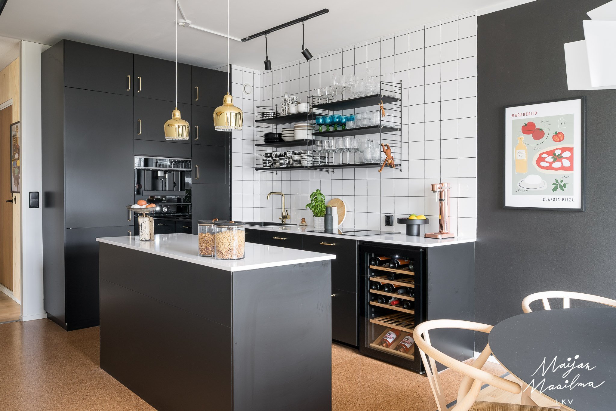 - Korkkilattia, maalatut/laatoitetut seinät. Mustat kaapistot (Ikea). Uuni, liesi integroidulla tuulettimella, kahvikone, viinikaappi, astianpesukone ja jääkaappi-pakastin.