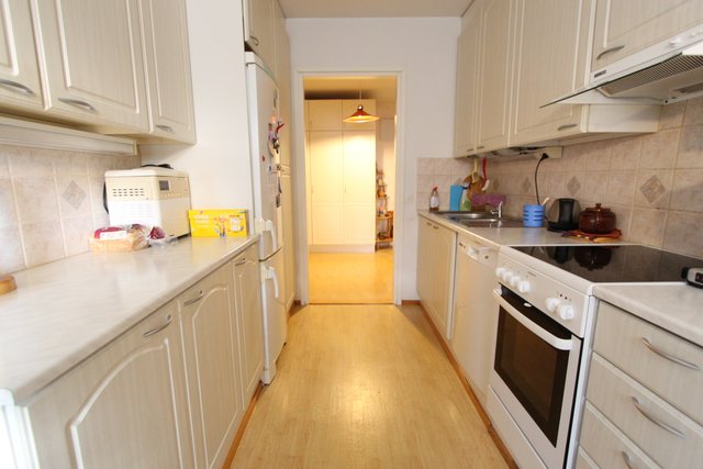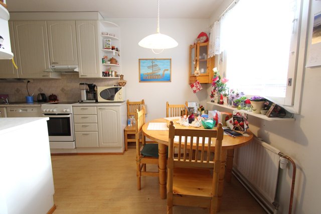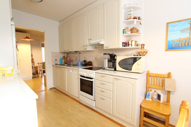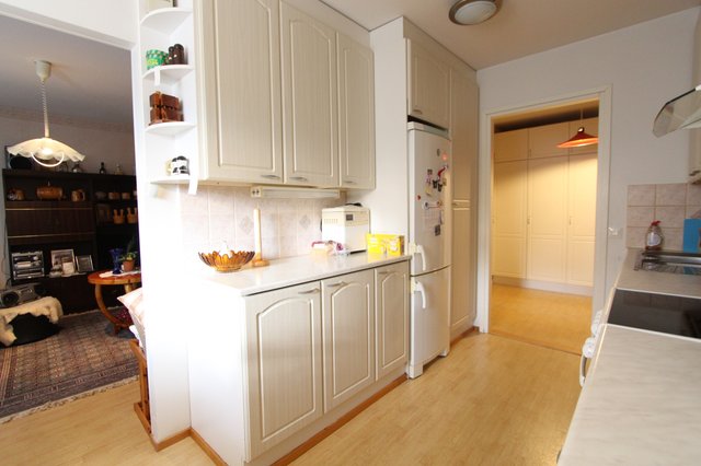 - Kaapistot, liesi, liesituuletin, jääpakastinkaappi, astianpesukone. Kaapistojen ovet uusittu.