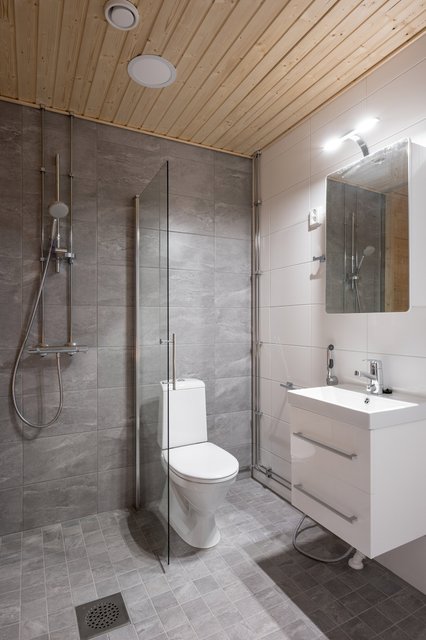 - WC-istuin, suihku, suihkuseinä, pesukoneliitäntä, ja peilikaappi