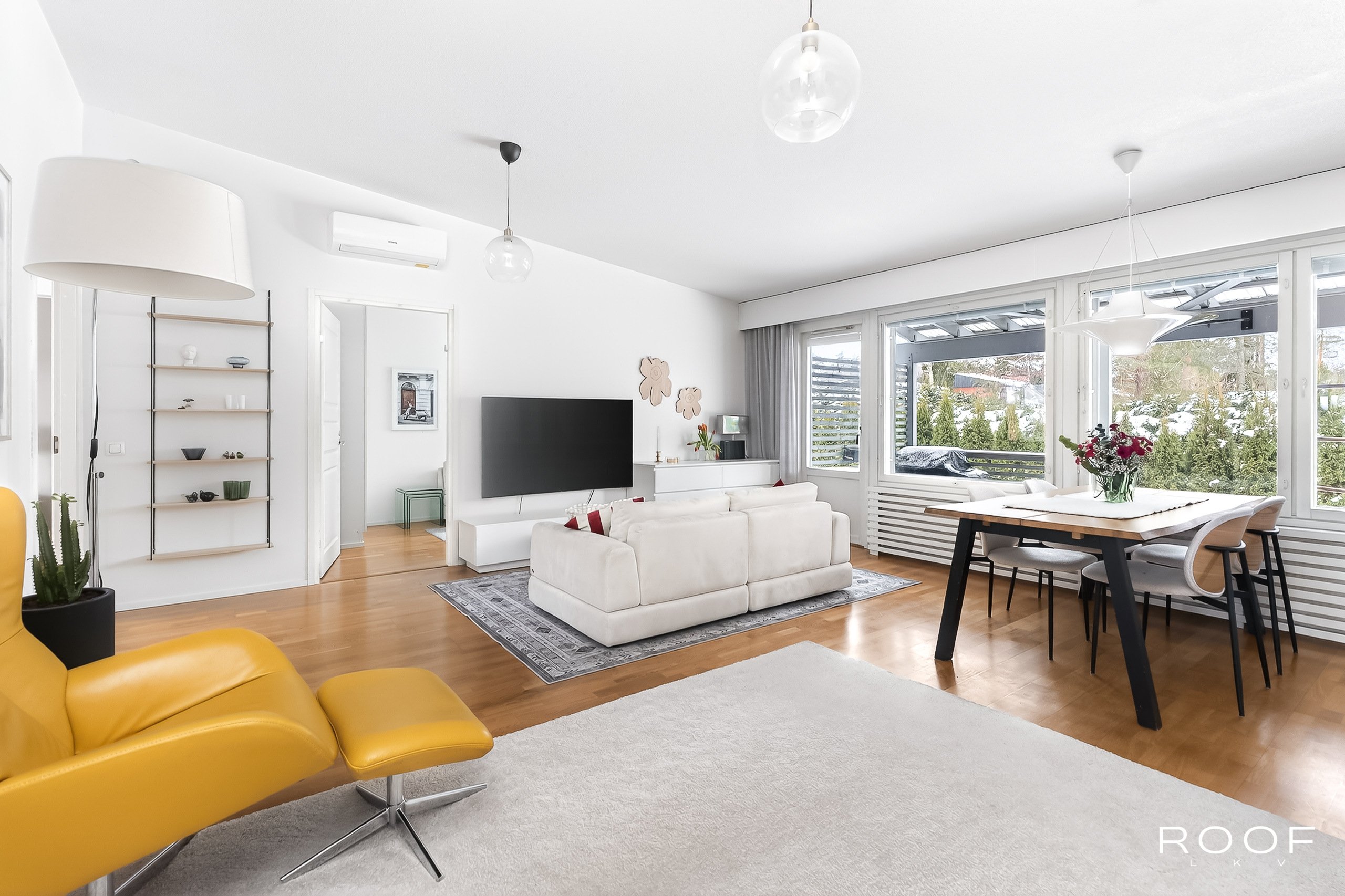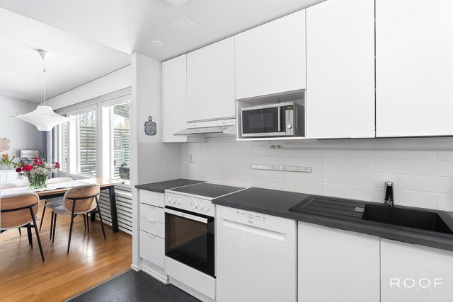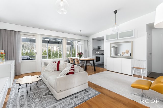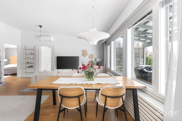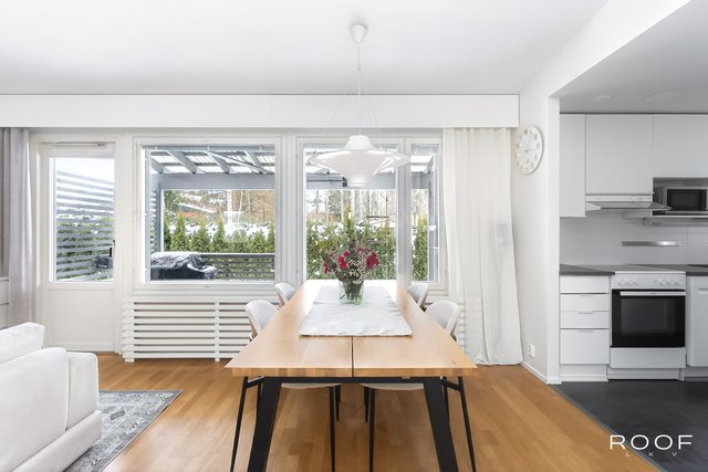 Olohuone, keittiö ja ruokailutila muodostavat yhtenäisen kokonaisuuden, jossa on helppo viettää aikaa niin arjessa kuin juhlassakin. Suuret ikkunat avautuvat suojaisalle, osittain katetulle terassille, joka suuntautuu lounaaseen. Täydellinen paikka nauttia ilta-auringosta.