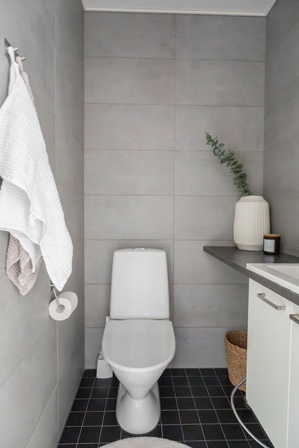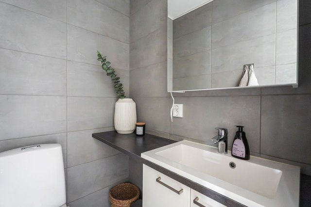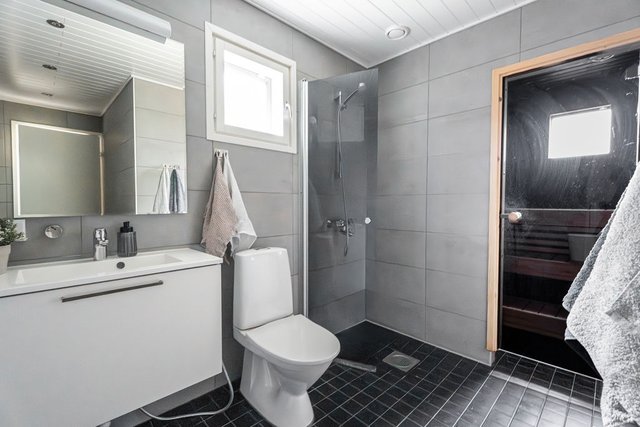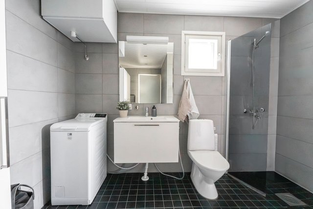 - WC-istuin, suihku, suihkuseinä, pesukoneliitäntä, lattialämmitys, peili, allaskaappi, ja pesuallas