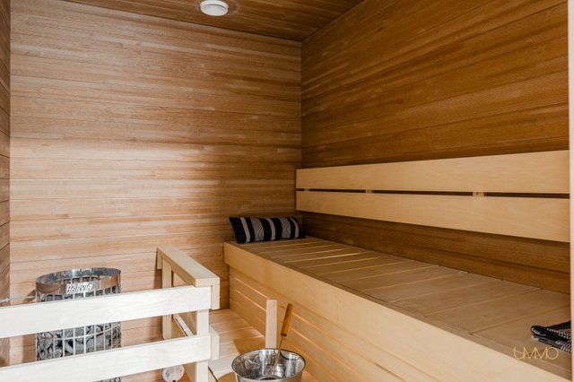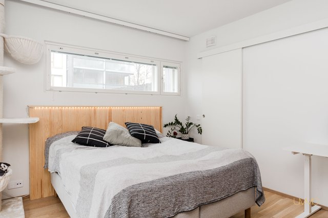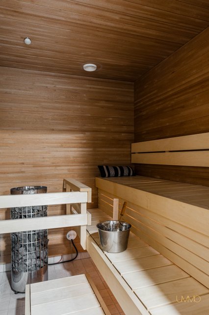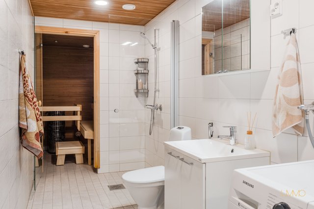 Makuuhuoneessa on vaatehuone ja liukuovet, jotka lisäävät tilan tuntua. Eteisessä on lisäksi molemmilla puolilla peililiukuovikaapistot. Harmoninen kylpyhuone- ja saunatila yhdistää esteettisyyden ja toimivuuden, luoden täydellisen paikan rauhoittumiselle.