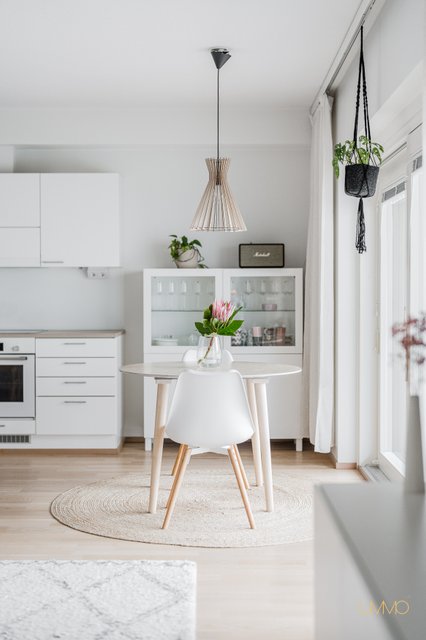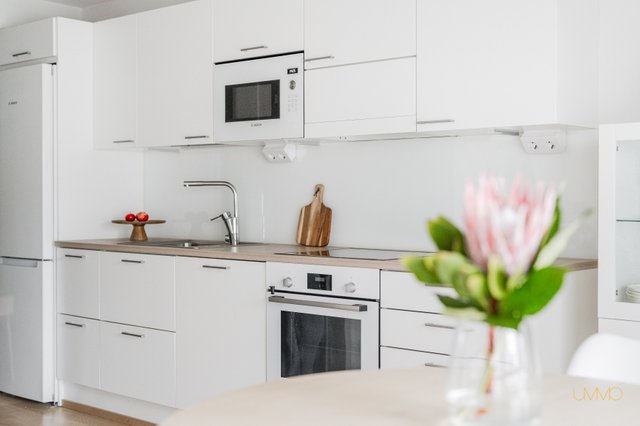 - Kaunis vaalea avokeittiö integroiduilla kodinkoneilla.