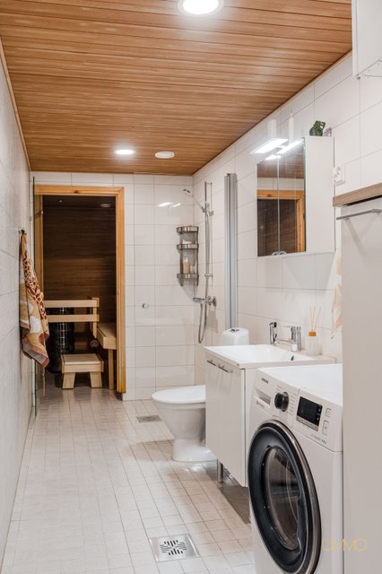 - WC-istuin, suihku, suihkuseinä, pesukoneliitäntä, lattialämmitys, peilikaappi, pesuallas, allaskaappi, ja bidee-suihku