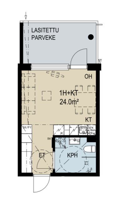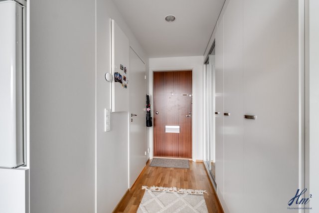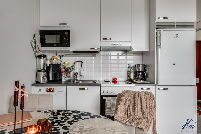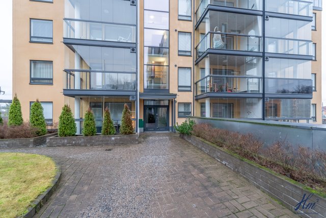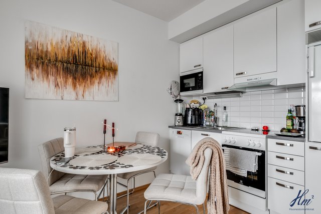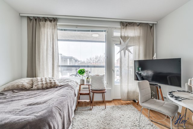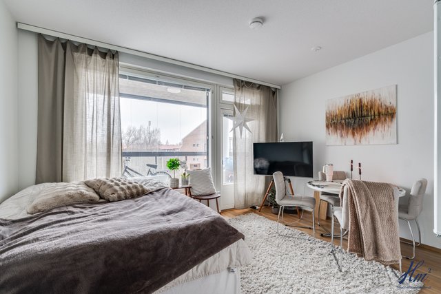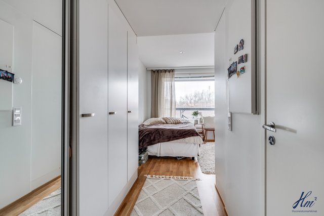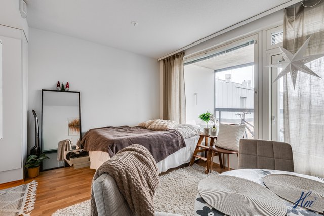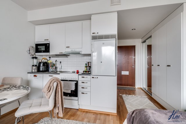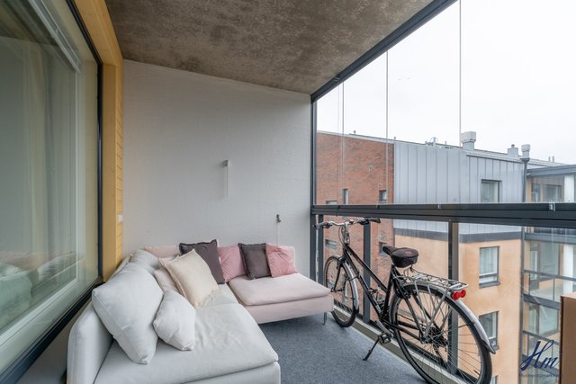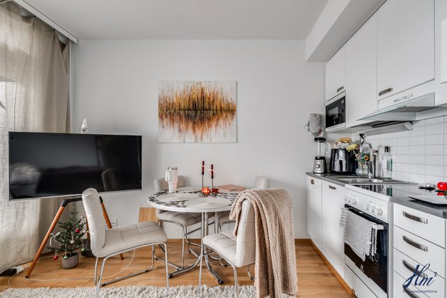 Asunnossa on käytännöllinen pohjaratkaisu, jossa yhdistyvät olohuone ja keittiö saumattomasti. Keittiö on varustettu nykyaikaisilla kodinkoneilla, kuten induktioliesi ja astianpesukone. Parvekkeella on lasitus, joka tuo lisätilaa ja mahdollisuuden nauttia ulkoilmasta ympäri vuoden. Kylpyhuoneessa on mukavuuksia, kuten lattialämmitys ja pesukoneliitäntä. Asunto myydään vuokrattuna.