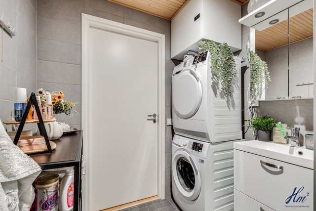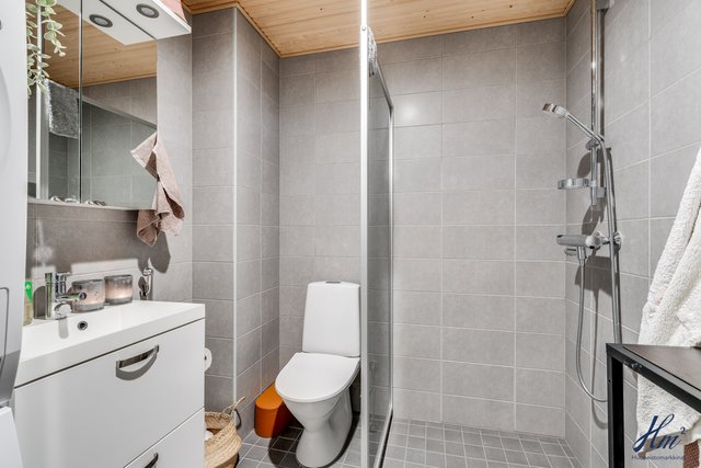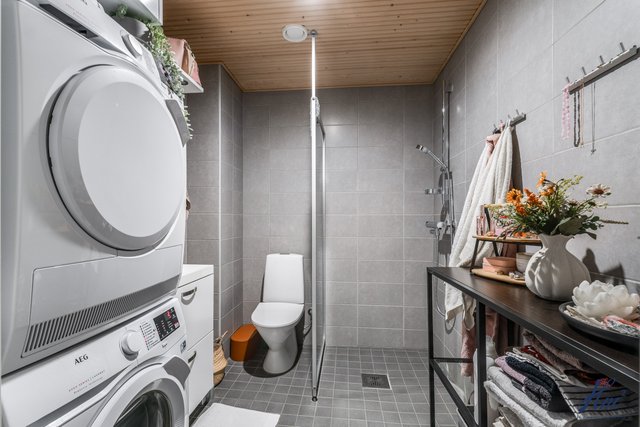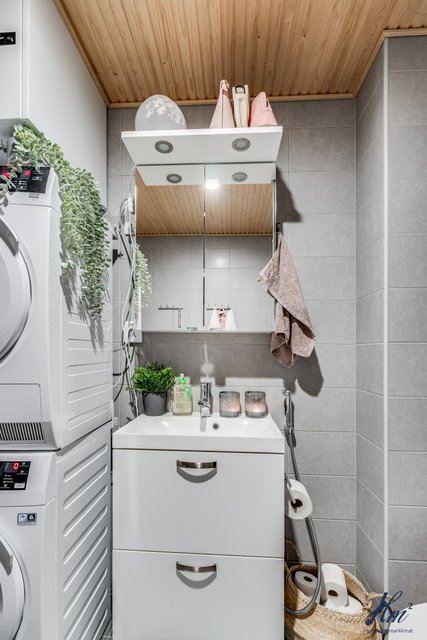 - WC-istuin, suihku, lattialämmitys, pesukoneliitäntä, allaskaappi, ja pesutorni