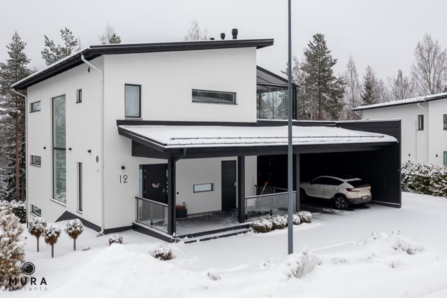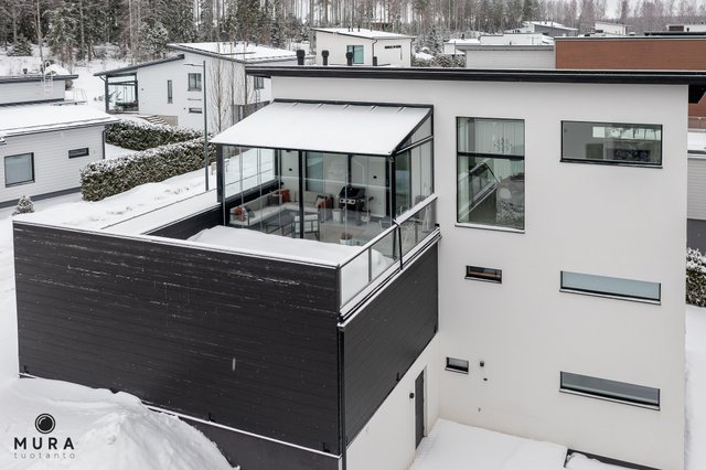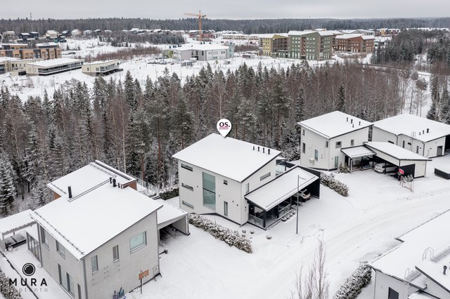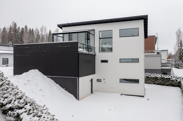 Tässä moderni ja erittäin valoisa kivitalo metsämaisemilla vaativaan makuun, jossa tilavia makuuhuoneita tai työhuoneiksi soveltuvia huoneita jopa 5 kappaletta. Viistokattoista ja avaraa oleskelutilaa ylimmässä kerroksessa ja kaikissa kolmessa kerroksessa toimivia tilaratkaisuja, sekä ajattomia ja kestäviä materiaalivalintoja; asuintilojen lattiapinnat ovat laatoitettu suurelta osin 90x90 laatalla.