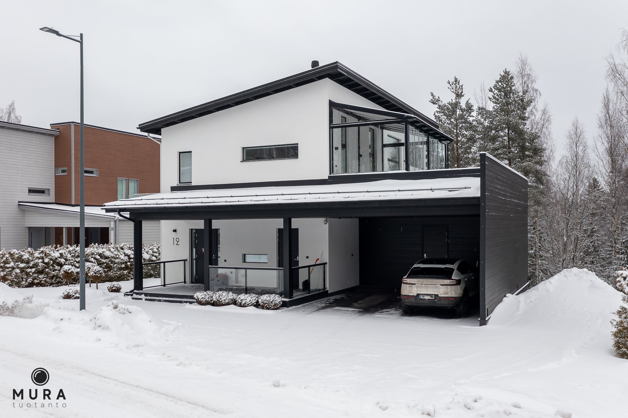 Talosta löytyy kolme sisäänkäyntiä; ns. arkieteiseen ja kodinhoitotilaan pääsee kauppakassien kanssa suoraan autokatoksesta, kun, taas vieraat voit ottaa vastaan näyttävään aulatilaan. Gradon teräsportaat vievät suoraan yläkerran suureen oleskelutilaan ja kaiteet ovat tietenkin lasia. Sisäänkäyntikerroksen pesuhuoneesta löytyy spa-osasto, joka käsittää saunan, kaksi suihkua sekä poreammeen. Pohjajkerroksen monimuotoisissa tiloissa voit treenailla tai harrastaa, sekä alakerran aula soveltuu vaikka lasten "pleikkarihuoneeksi" tms..
