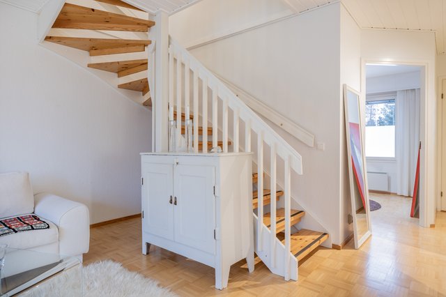 Asuintilat ovat kahdessa kerroksessa. Alakerrassa on valoisa avokeittiö yhdistyen olohuoneeseen, josta käynti takapihan terassille ja isolle rauhalliselle piha-alueelle. Alakerrasta löytyy myös makuuhuone, erillinen wc sekä kodinhoitotila, kylpyhuone ja sauna. Yläkerrassa on toinen WC-tila sekä makuuhuone, josta käynti tilavalle parvekkeelle. Makuuhuoneen vieressä on pienempi ikkunallinen tila, jota voi käyttää esimerkiksi harrastetilana.
