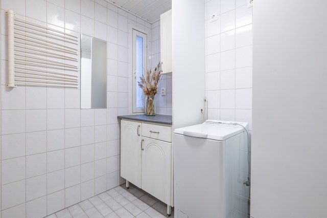 - Lattialämmitys, pesukoneliitäntä, lattiakaivo, lämminvesivaaraja, pöytätaso, ja tila pesutornille