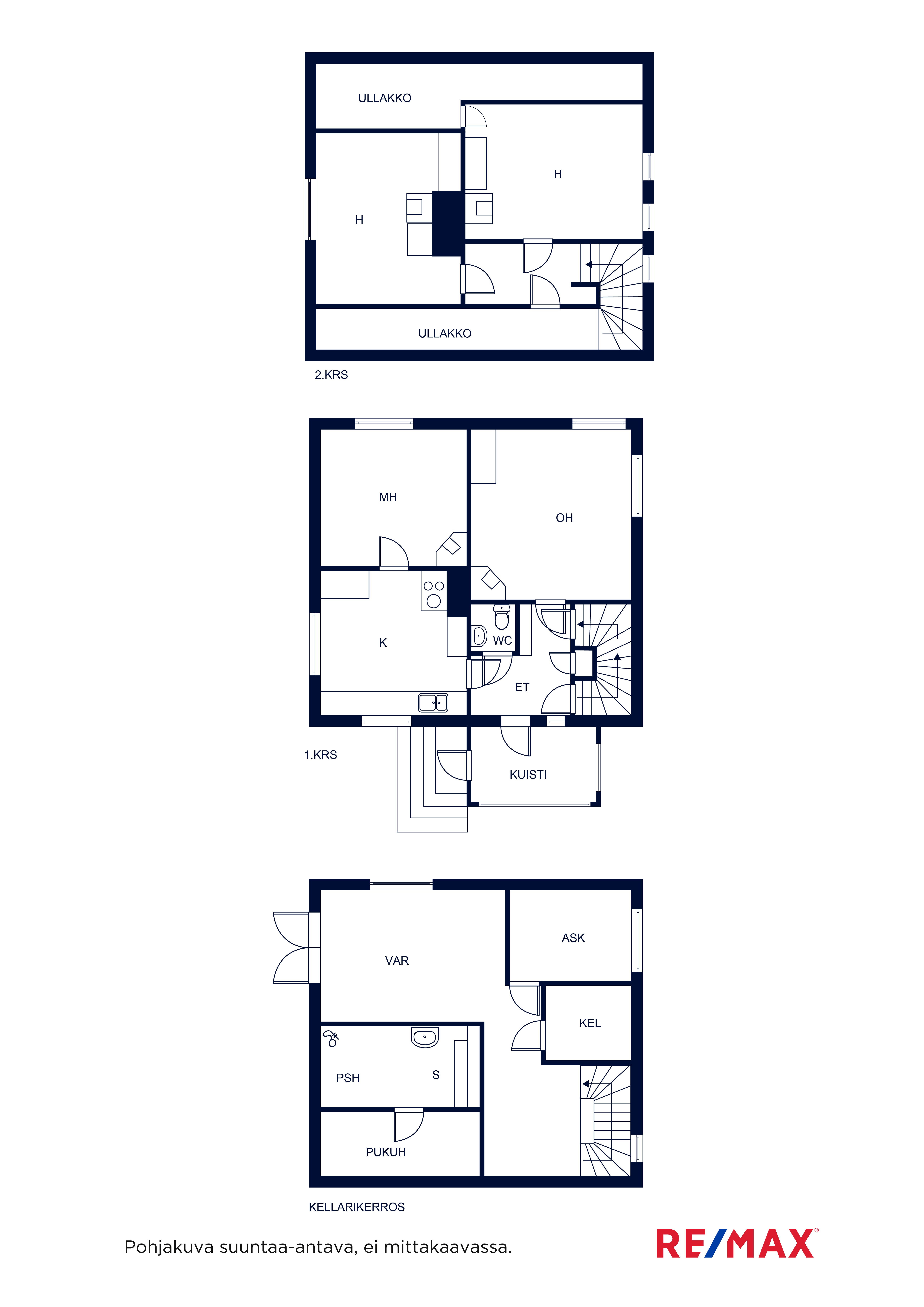 Kolmikerroksisessa talossa on kolme makuuhuonetta, olohuone, keittiö ja erillinen wc. Alakerran makuhuonetta saa helposti avattua olohuoneen suuntaan, jolloin oleskelutilaa saadaan lisää tai vaikkapa erillinen ruokailutila. Kellarikerroksesta löytyy saunan ja suihkun lisäksi reilusti varastotilaa, pieni askartelu-/verstashuone sekä hillo-/viinikellari.