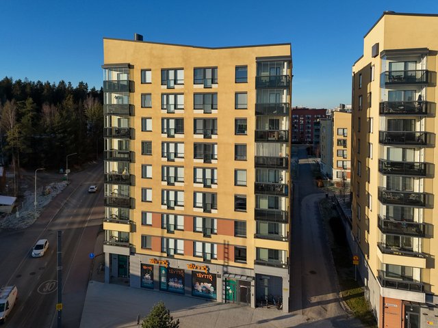 Tämä valoisa viiden kerroksen yksiö tarjoaa arkeen toimivuutta. Kodin suuret ikkunat avautuvat suojaisalle sisäpihalle. Avokeittiö ja olohuone muodostavat käytännöllisen ja viihtyisän kokonaisuuden. Makuualkovi tarjoaa rauhallisen oman tilan levolle ja selkeyttää huoneen sisustusta. Koko asunnon levyinen lasitettu parveke toimii kuin lisähuoneena suurimman osan vuodesta. Tilava, laatoitettu kylpyhuone mahdollistaa myös toimivan pyykkihuollon. Asuntoihin kuljetaan juuri uudistetun ja hyvin valaistun porraskäytävän kautta.