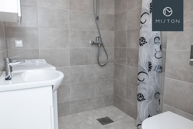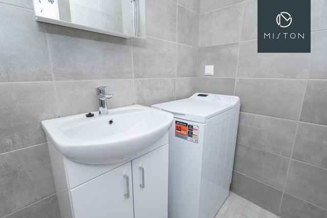 - Suihkuseinä, pesukone, peili, allaskaappi, ja pesuallas