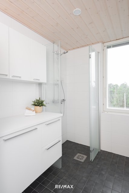 - Tyylikäs ikkunallinen kylpyhuone, joka on saneerattu linjsaneerauksen yhteydessä. VARUSTEET: allaskaappi, peilikaappi, kodinhoitopiste, seinäkaappi, pesukoneliitäntä, suihku, suihkuseinä, wc-istuin, lattialämmitys. LATTIA: laatta SEINÄT: laatta