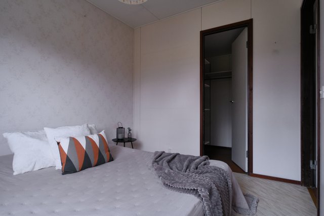 - Makuuhuoneen ikkunasta on näkymä oman taloyhtiön etupihalle. Parivuode yöpöytineen sijoittuu mukavasti tähän tilaan. Säilytystilana löytyy isohko vaatehuone.