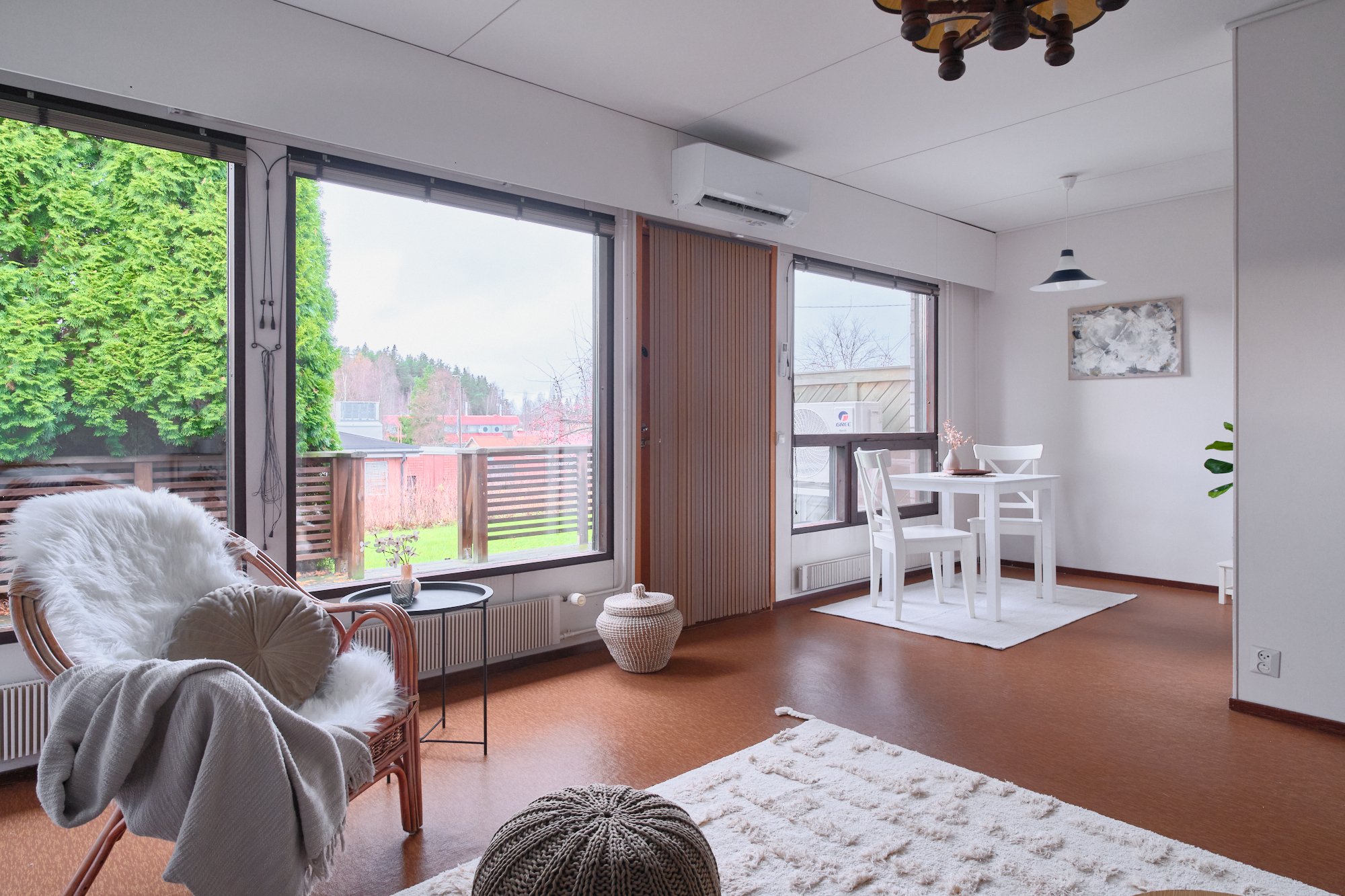 Asunnon sydän on valoisa olohuone, josta avautuu näkymä omalle tilavalle terassille. Terassi on täydellinen paikka rentoutua ja nauttia rauhallisesta ympäristöstä. Keittiö on käytännöllinen ja alkuperäiset valkoiset kaapistot ovat säilyneet siisteinä. Makuuhuoneessa on tilava vaatehuone, joka tarjoaa runsaasti säilytystilaa.
