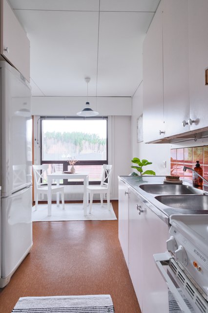 - Keittiöön on kulku sekä eteisestä että olohuoneesta. Ruokapöydälle löytyy tila ikkunan äärestä ja voitkin ruokaillessa nauttia omalle terassille ja takapiha-aluelle avautuvasta maisemasta. Alkuperäiset, valkoiset kaapistot ovat edelleen siistissä kunnossa.