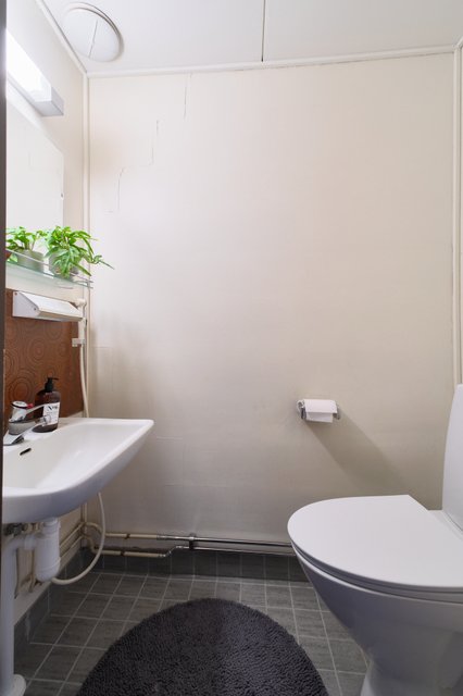- Erillinen WC helpottaa perheen aamuaskareita. WC-tilan lattia on laatoitettu vuonna 2024.