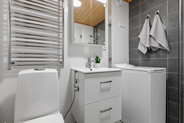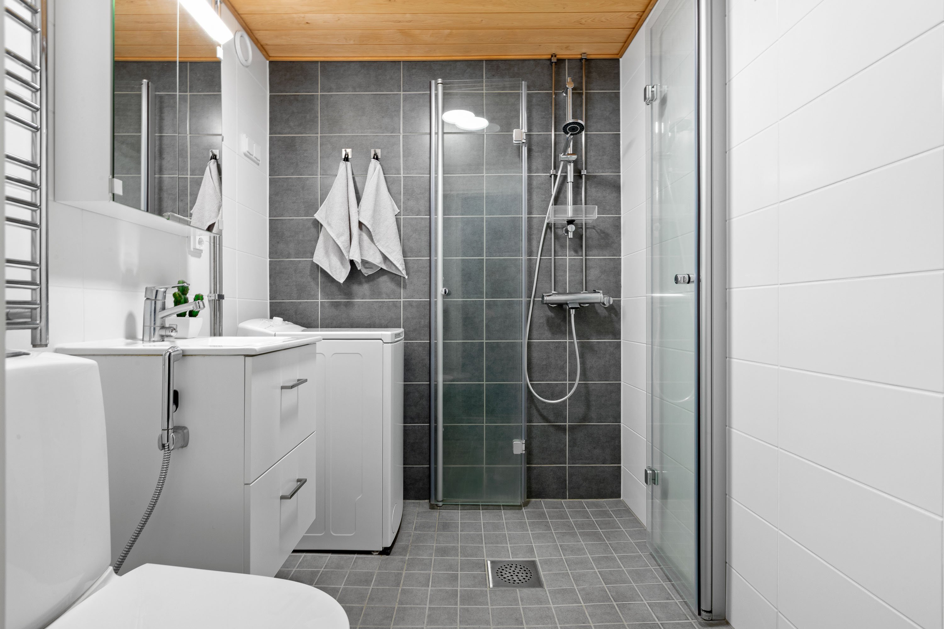 - Suihkuseinä, suihku, pesukoneliitäntä, wc-istuin, peilikaappi, allaskaappi, ja pyyhekuivain, kiinteät valais katossain