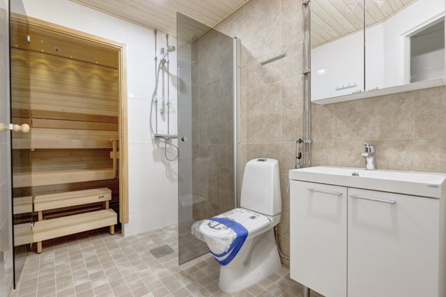 - Suihku, suihkuseinä, wc-istuin, pesuallas, allaskaappi, peili tai peilikaappi, bidee-suihku, lattialämmitys, ja pesukoneliitäntä