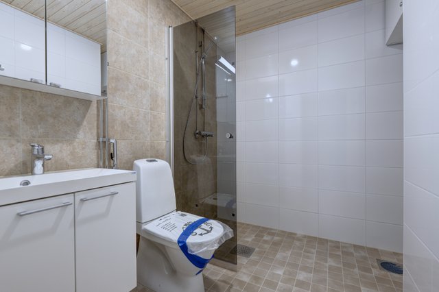 - Suihku, suihkuseinä, wc-istuin, pesuallas, allaskaappi, peili tai peilikaappi, bidee-suihku, lattialämmitys, ja pesukoneliitäntä