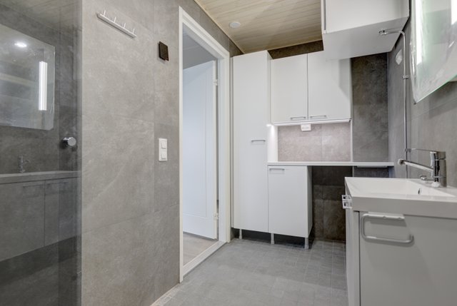 - Suihku, suihkuseinä, wc-istuin, pesuallas, allaskaappi, peili tai peilikaappi, bidee-suihku, lattialämmitys, ja pesukoneliitäntä