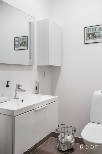 - Lattia laattaa, seinät maalattu, wc-istuin, valopeili, seinäkaappi, pesuallas, allaslaatikosto ja bideesuihku.