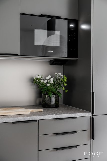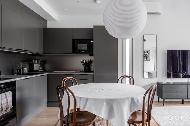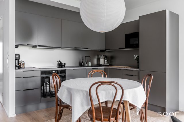 - Avokeittiö uusittu v. 2025. Novartin kaapistot, kalusteuuni, induktioliesitaso, integroitu astianpesukone, integroitu jääkaappipakastin, integroitu mikroaaltouuni, laminaattitasot, välitila lasia. Seinät maalattu, lattia lankkumaista saarniparkettia.