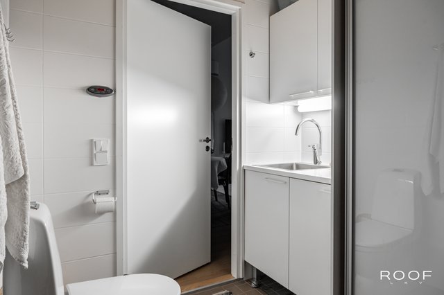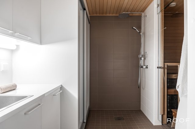 - Pesuhuone/kodinhoitohuonetilassa on sadesuihku, wc-istuin, pesukoneliitäntä, tila pesutornille, pesuallas, allaskaapisto, kaapisto ja liukuovikakaapisto. Seinät ja lattia laattaa.