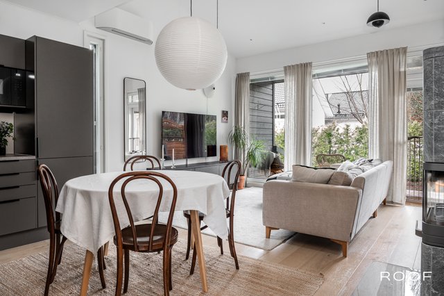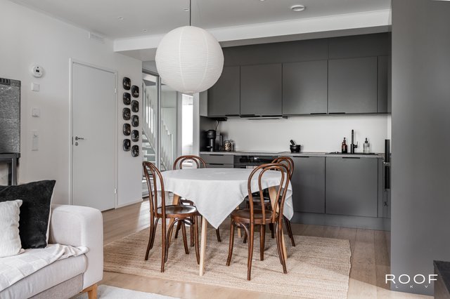 Tyylikäät Novartin kaapistot on uusittu keittiöön vuonna 2025. Suuret ikkunapinnat ja olohuoneen korkea viistokatto tuovat lisää tilan tuntua. Kaksi autopaikkaa, toisessa latausmahdollisuus ja toisessa lämmitystolppa. Lähikauppa, koulu ja päiväkoti ovat kävelymatkan päässä.