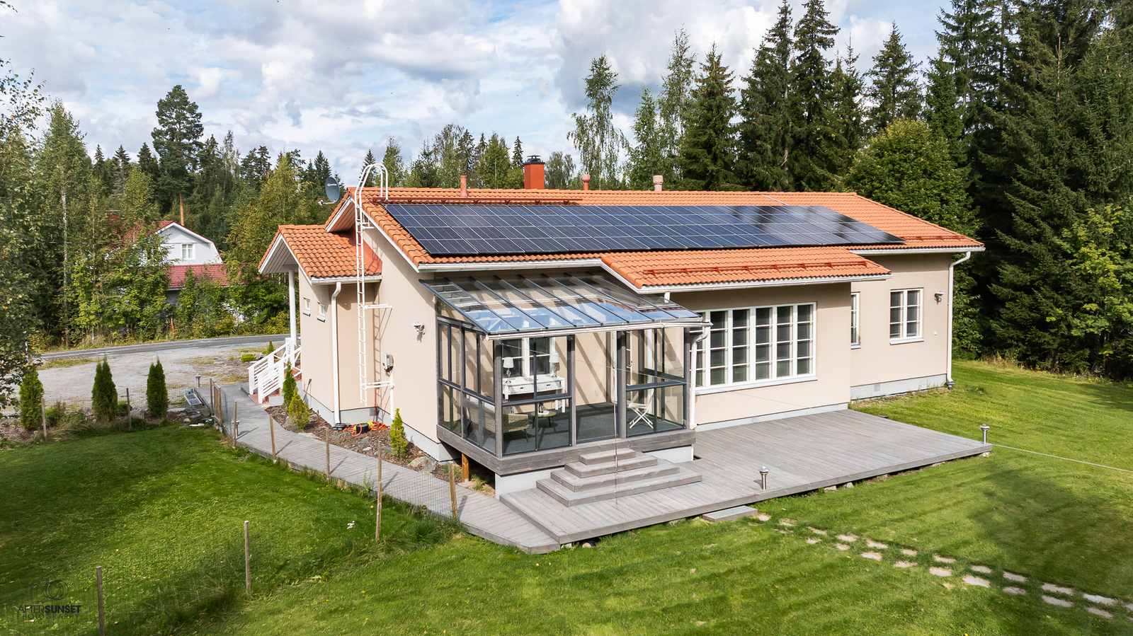 Kodissa suuri lasitettu aurinkoterassi mikä palvelee kaikkina vuodenaikoina sekä metsän suojassa pihasauna paljulla.