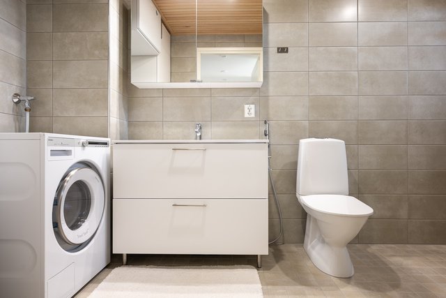 - Suihku, allaskaappi, lattialämmitys, suihkuseinä, wc-istuin, peilikaappi, pesukoneliitäntä, ja kiinteät valaisimet