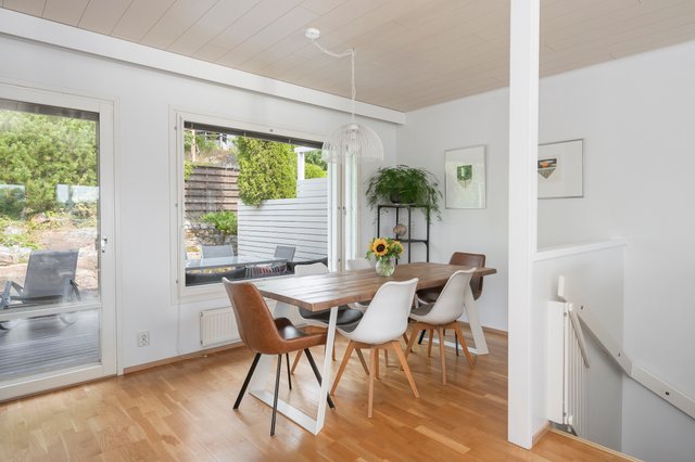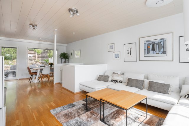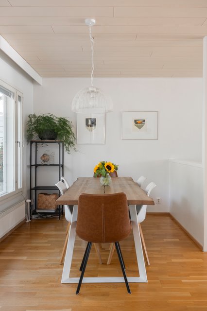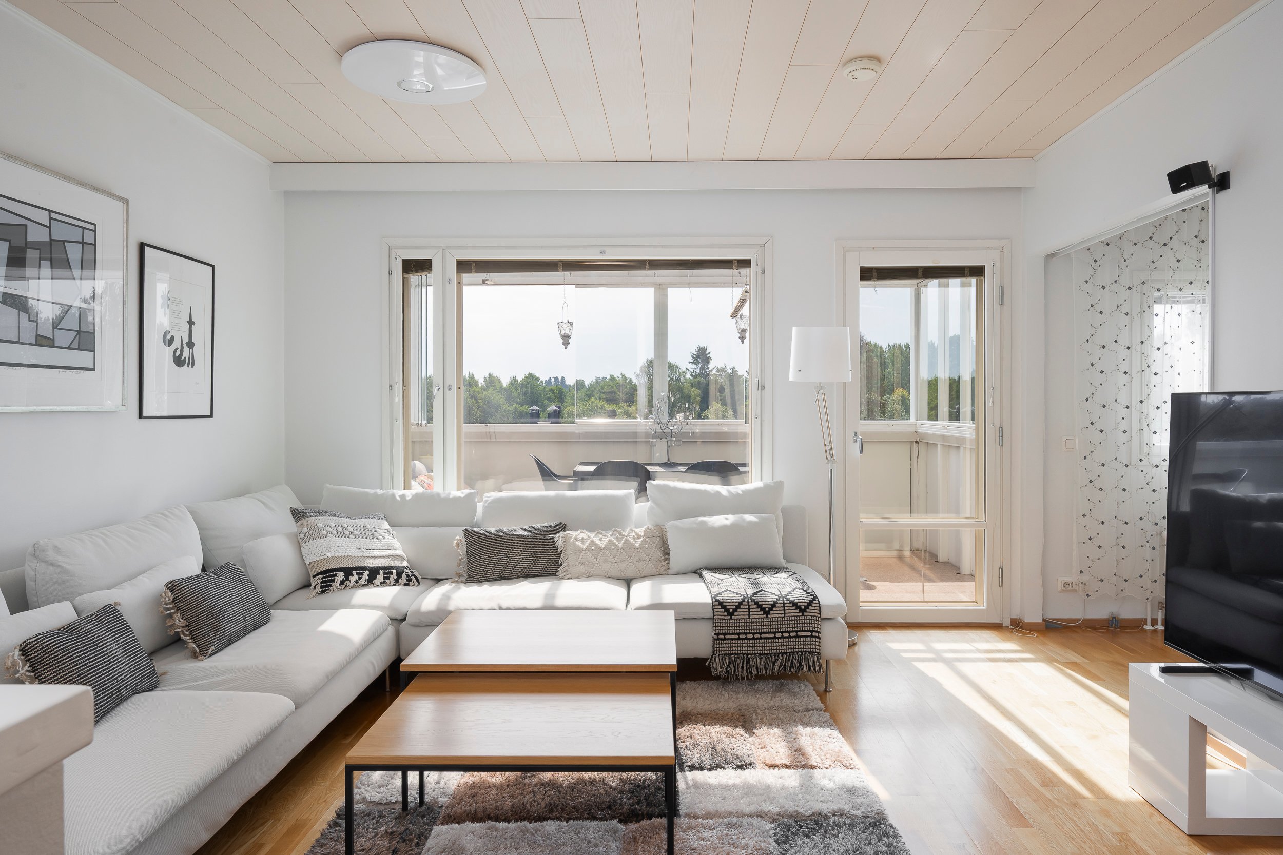 - Valoisa olohuone jatkuu ruokailutilasta yhtenäisenä tilana. Olohuoneeseen mahtuu suurempikin sohva. Lisätilaa tuo lasitettu parveke idän suuntaan. Toisella, ruokailutilan puolella, on rauhallinen piha-alue terasseineen lännen suuntaan.