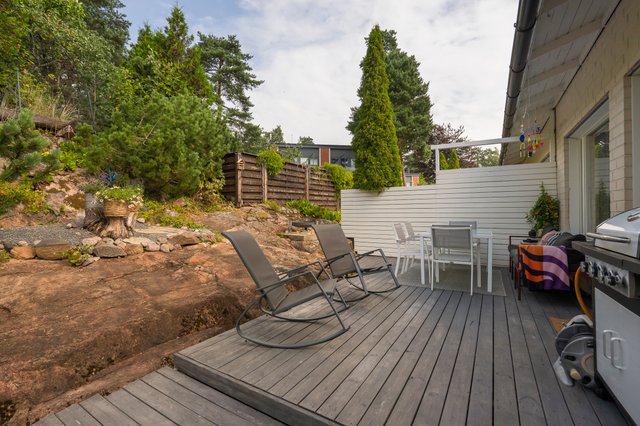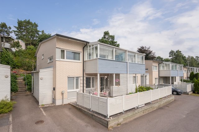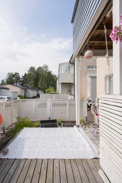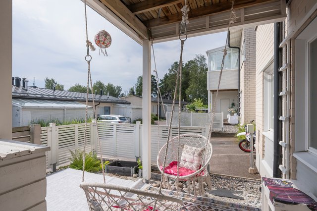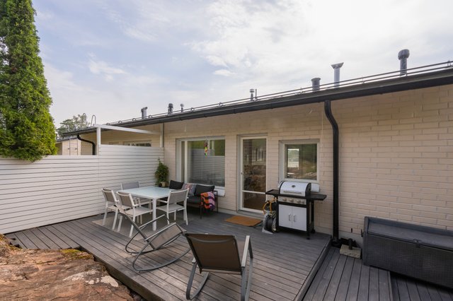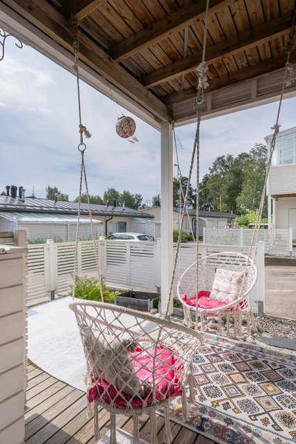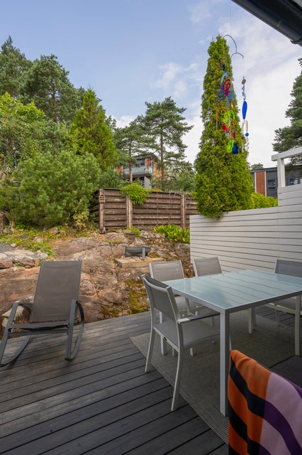 Oma etu- ja takapiha terassilaudoituksineen kutsuvat rentoutumaan ja nauttimaan ulkoilmasta. Piha-alueet tarjoavat mahdollisuuksia kesäkeittiölle ja ulkokalusteille, ja talvisaikaan merikin pilkistää näkymissä. Asuntoon kuuluu myös oma sauna, joka täydentää mukavasti arjen luksusta.