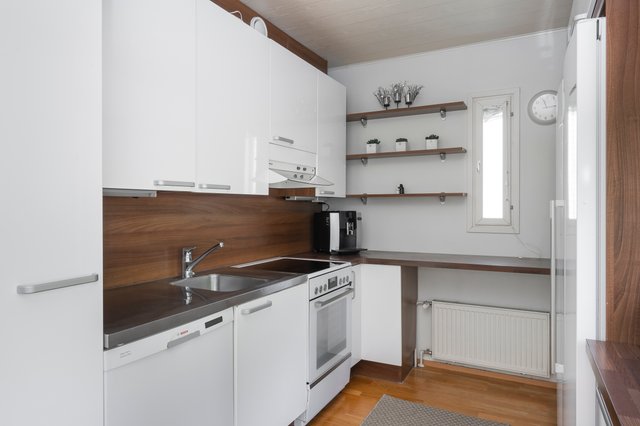 - Valkoisessa korkeakiiltoisessa Puustellin keittiössä on pähkinänsävyiset kaapistojen välitila sekä laminaattitasot. Keittiössä on hyvin laskutilaa.