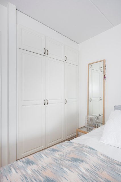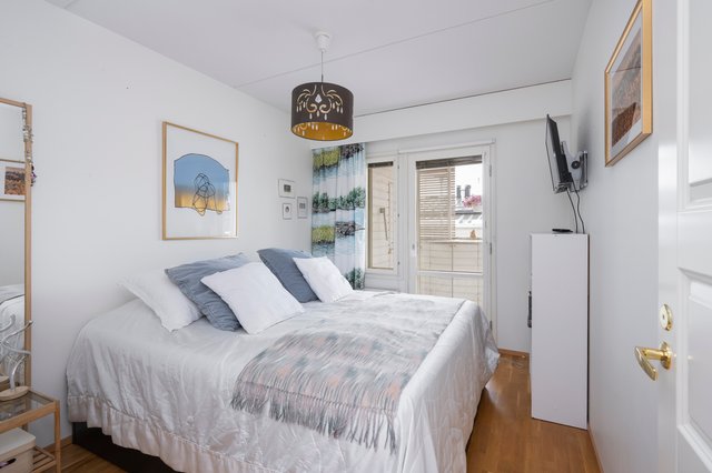 - Neljä makuuhuonetta jaottuvat kolme alakertaan ja yksi yläkertaan. Kaikissa on kiinteät kaapistot ja alakerran päämakuuhuoneesta on käynti ulos etupihan idän suunnan terassille.