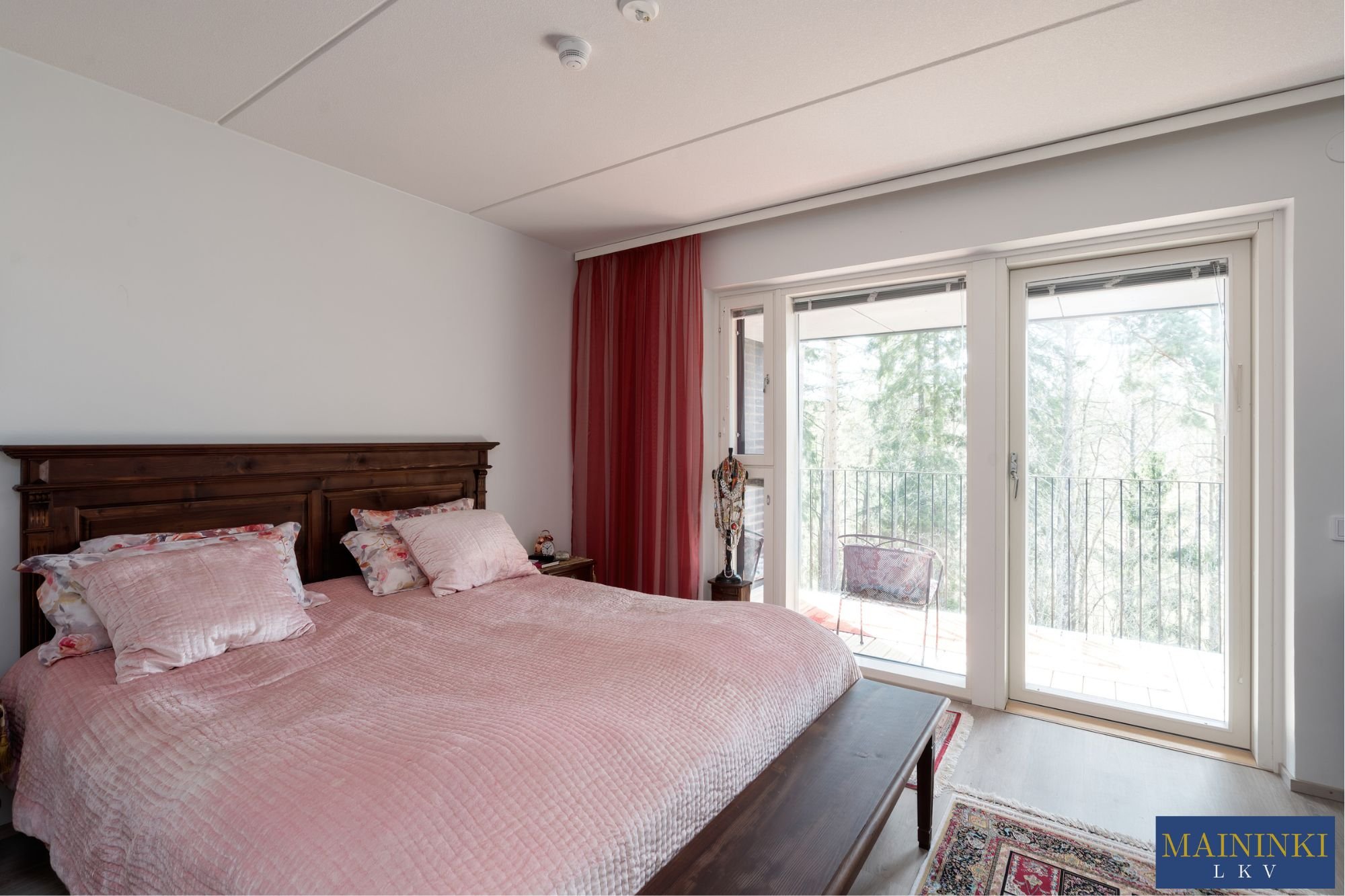 Sisääntulokerroksen avokeittiössä on energiatehokkaat kodinkoneet ja se yhdistyy luontevasti olohuoneeseen, jossa on korkea huonekorkeus. Isot ikkunat päästävät paljon luonnonvaloa sisään ja näkymä avautuu puistoon - tuntuu kuin asuisit puiden latvoilla! Olohuoneesta on myös käynti isolle, yksityiselle terassiparvekkelle, josta tulee kesäisin lisähuone. Sisääntulokerroksessa on myös vessa, jossa on myös suihku. Alakerran makuuhuone pysyy mukavan viileänä ja sen yhteydessä on myös yksityinen parveke. Kylpyhuoneeseen mahtuu hyvin pesutorni ja huoneistossa on myös oma sauna. Asunto-osakkeen yhteydessä myydään lämmin autotalliosake, velaton myyntihinta 25 000 €.