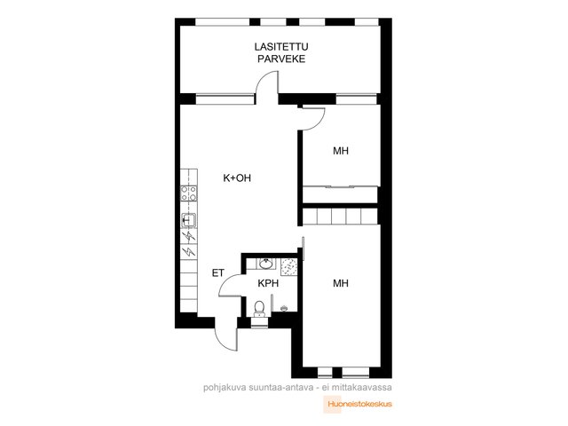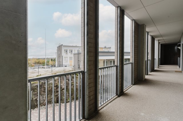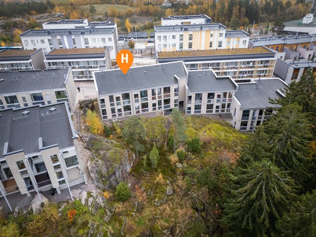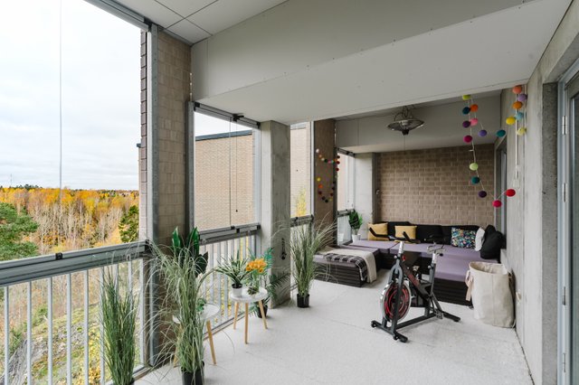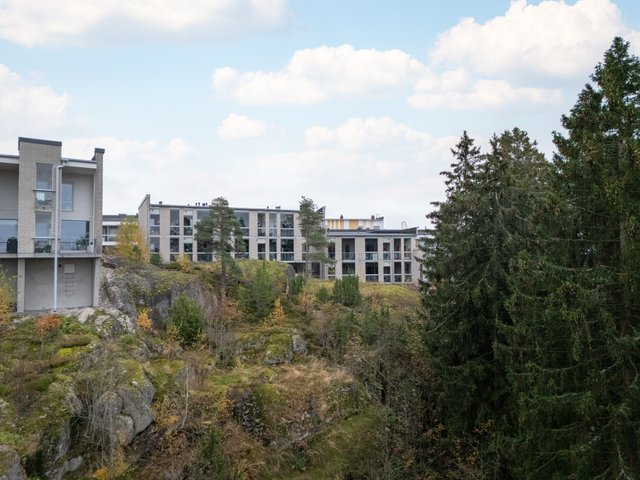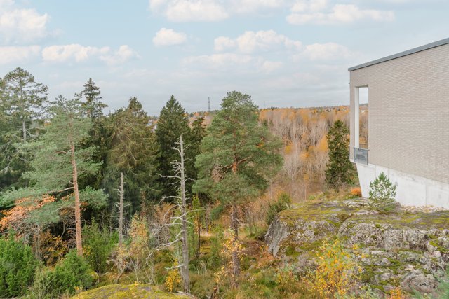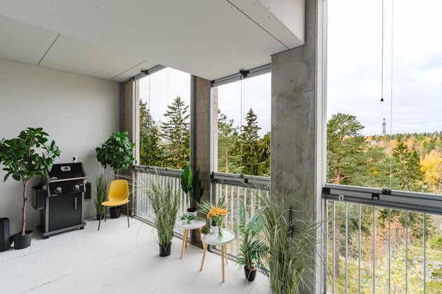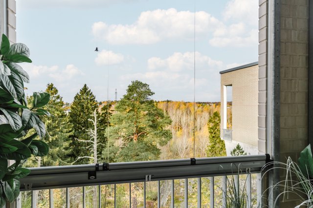 - Huoneistolla on suuri, noin 20 m² lasitettu parveke, joka avautuu länteen. Näkymät avautuvat kauniiseen metsä- ja kalliomaisemaan.