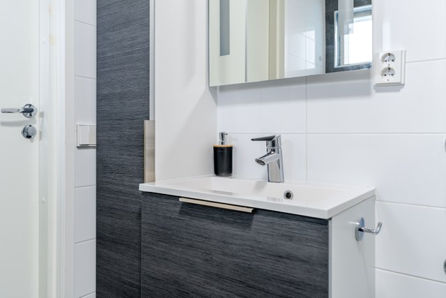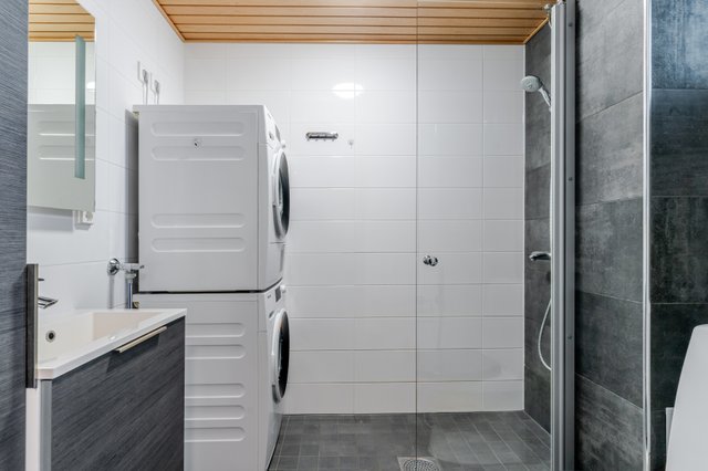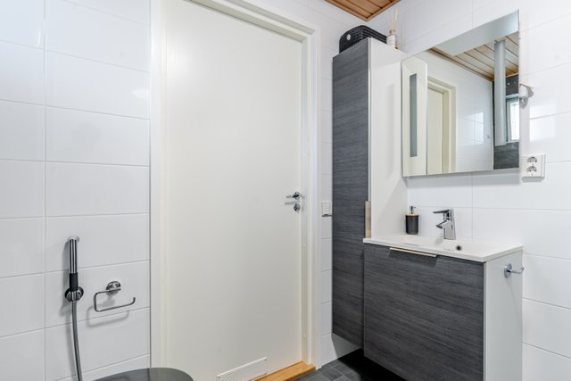 - WC-istuin, suihku, suihkuseinä, peili, allaskaappi, bidee-suihku, lattialämmitys, ja pesukoneliitäntä