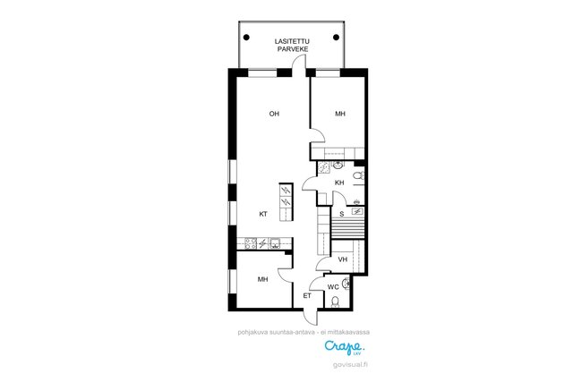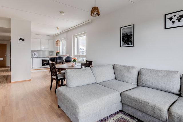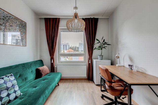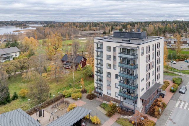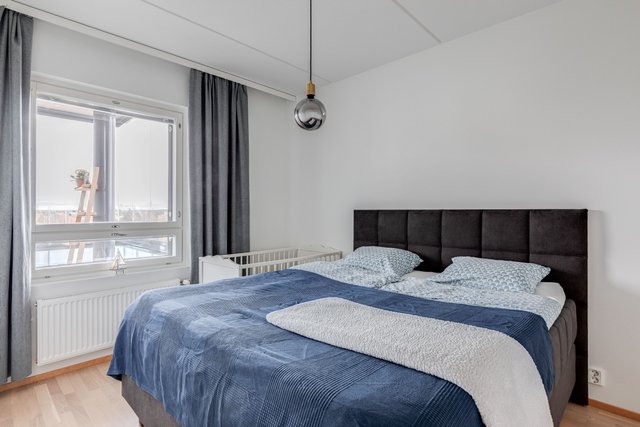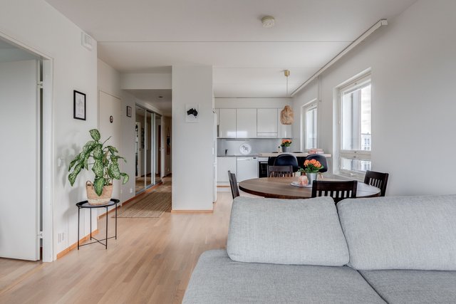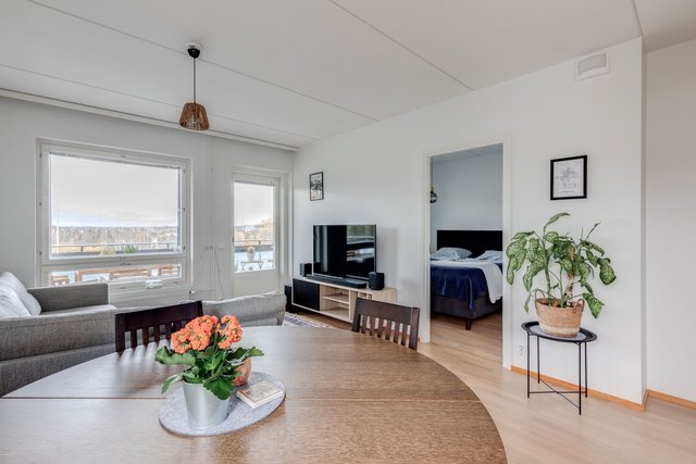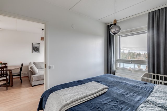 Asunto on kulmahuoneisto, joten valoa tulee läpi päivän. Tilava lasitettu parveke aukeaa länteen, ja sieltä on esteettömät näkymät. Merikin näkyy. Pohja asunnossa on toimiva, ja kaksi hyvänkokoista makuuhuonetta tarjoaa asumiseen mahdollisuuksia, olit sitten yksin, kaksin tai isommalla porukalla. Tilava kylpyhuone omalla saunalla ja erillinen wc lisäävät arjen toimivuutta.
